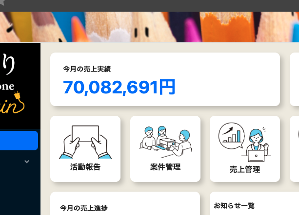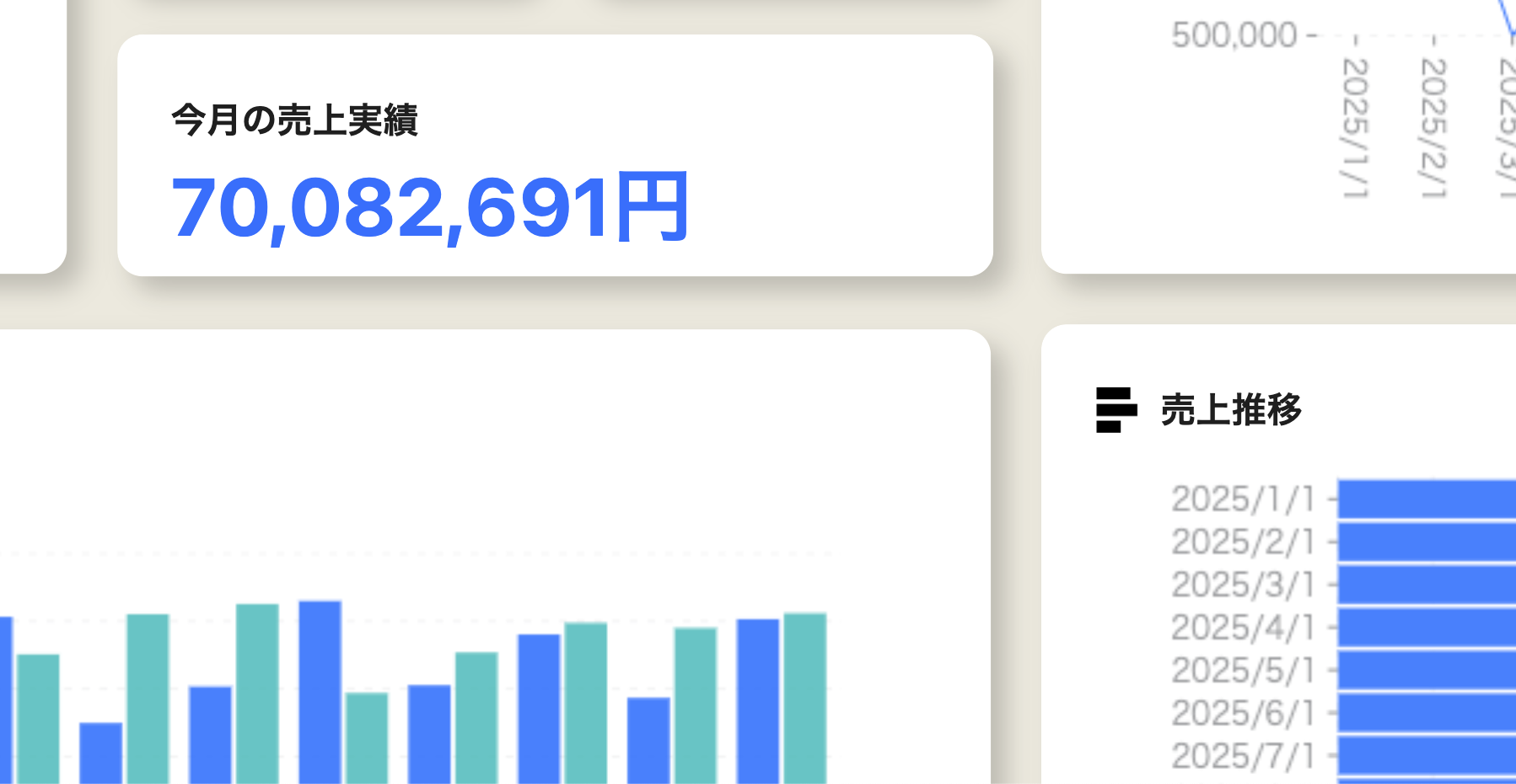 ↑のように、毎月の売上実績や目標達成率などの重要な数値を、ポータルで一目で確認できるようにカスタマイズします。