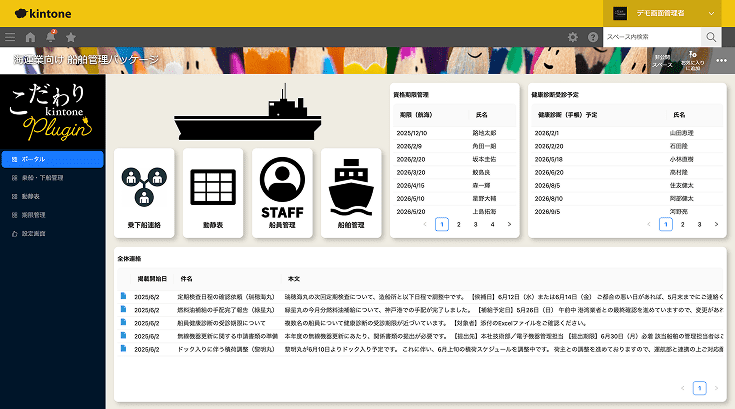 船舶動静、乗下船管理、船員資格、船舶証明書の期限管理。バラバラだった管理業務をkintone上で統合し、重複入力と人為的ミスを根絶します。